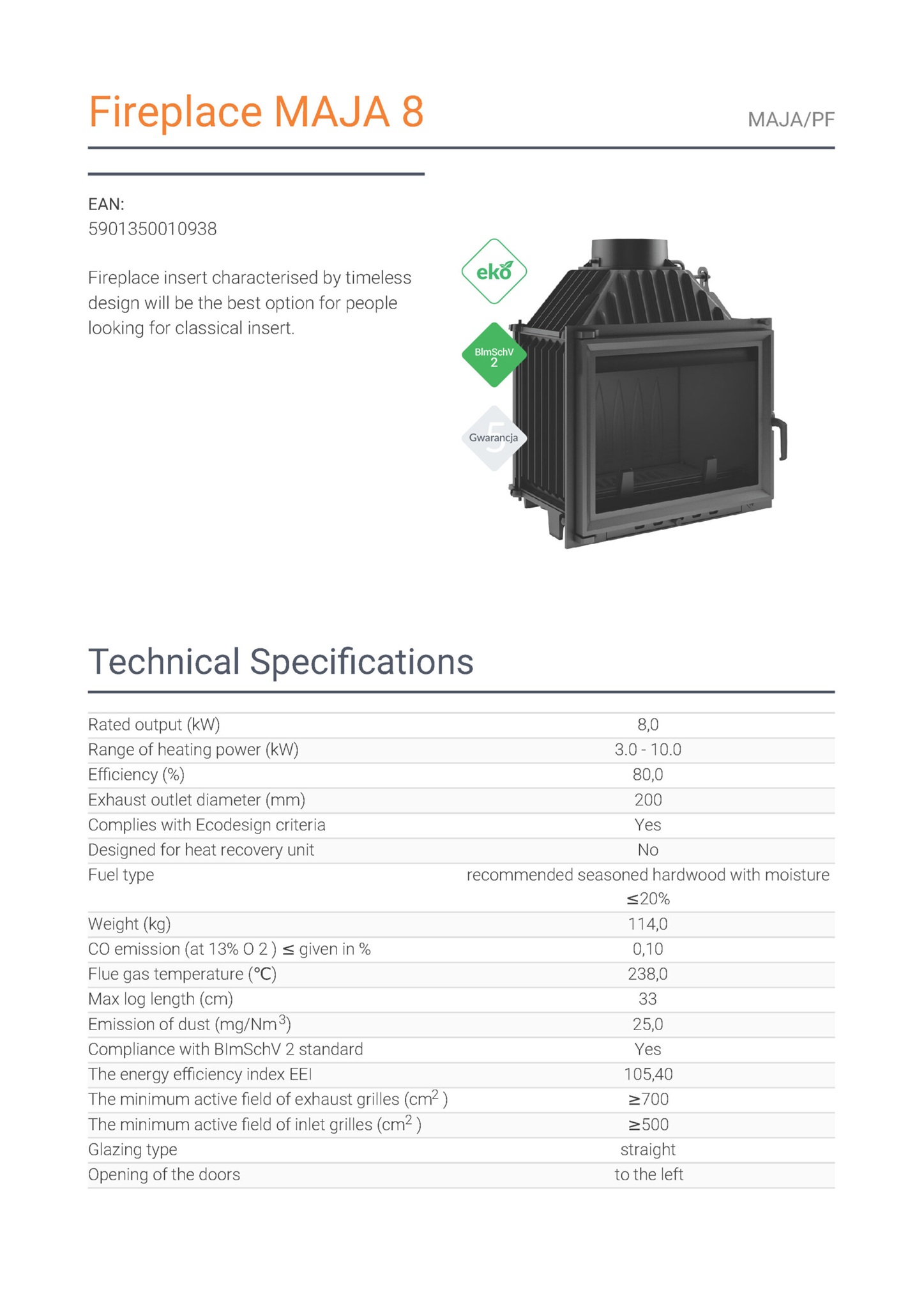 The KRATKI MAJA/PF straight 8kW energy fireplace insert is a reliable and efficient heating solution for modern homes. Designed to heat spaces of approximately 90–120 square meters, it provides excellent energy efficiency, economical wood consumption, and a warm atmosphere in any living space.
