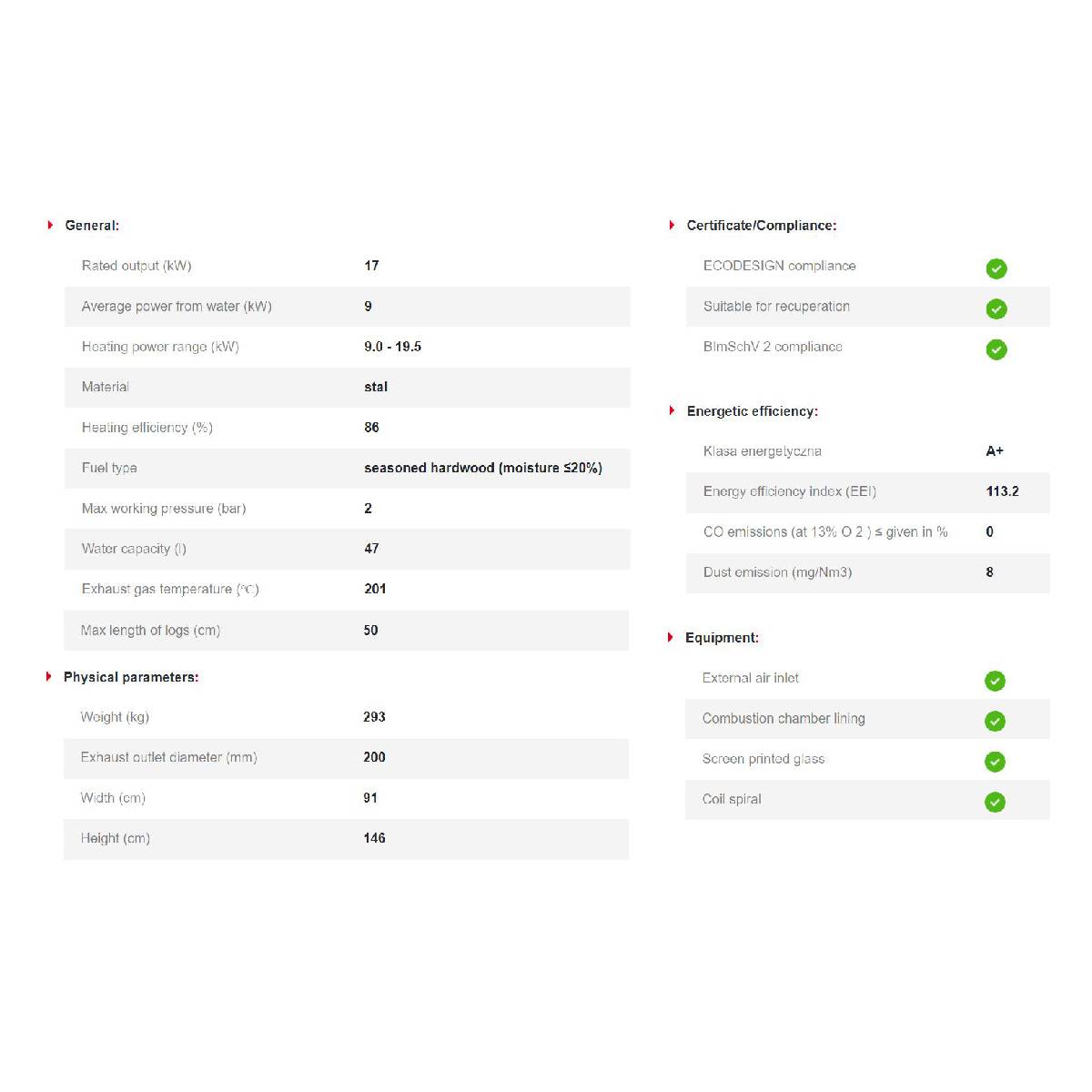The KRATKI MBA/PW/17/L or P/BS/W (A+) is an advanced water fireplace boiler designed for efficient and eco-friendly heating of large residential spaces. With a nominal output of 17kW and a heating capacity ranging from 100 to 205 m², it is an ideal solution for connection to central heating systems (radiators), delivering high performance and significant energy savings.