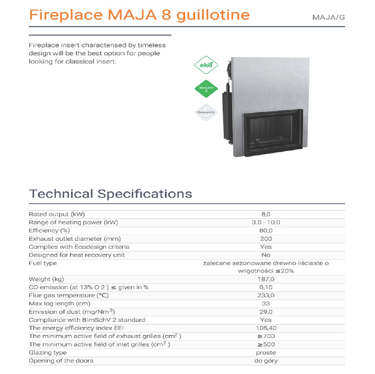 Η καύση ξύλου αποτελεί φυσική και αποδοτική επιλογή θέρμανσης. Χάρη στον υψηλό βαθμό απόδοσης, το KRATKI MAJA/G 8kW συμβάλλει στη μείωση εκπομπών και στη βέλτιστη αξιοποίηση καυσίμου.