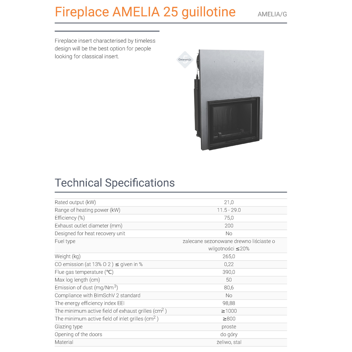 KRATKI AMELIA/G 21kW është një oxhak energjetik prej gize me derë rrëshqitëse, i projektuar për ngrohje të fuqishme dhe ekonomike të hapësirave të mëdha nga 200 deri në 250 m². Kombinon fuqi të lartë, ndërtim të fortë dhe dizajn modern, duke ofruar efikasitet të shkëlqyer termik dhe komoditet në përdorim të përditshëm.